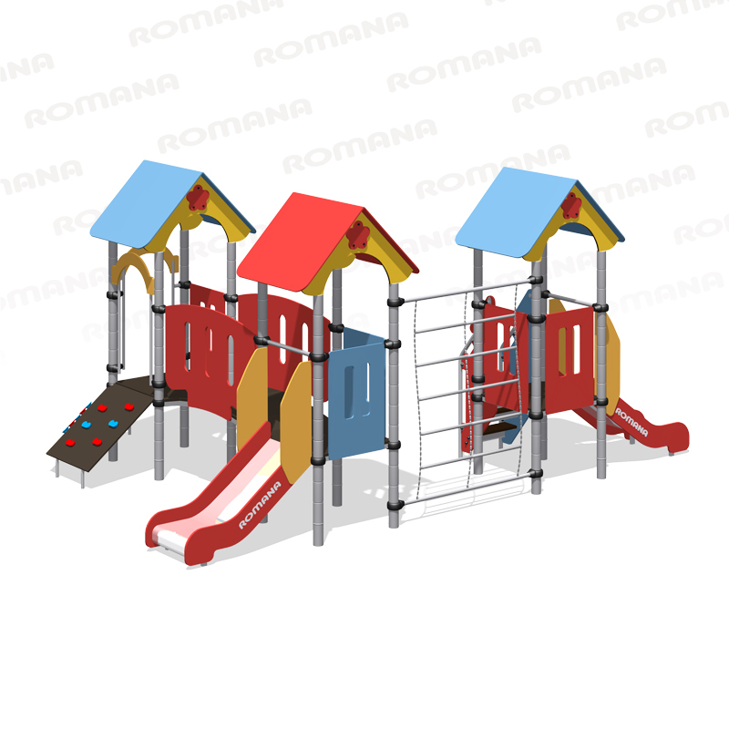 Детская площадка «Romana 104.12.00» - это игровой комплекс с домиками-горками, скалодромом, сеткой для лазанья. Помогает развивать у детей гибкость, ловкость и укреплять мышцы.Изделие устанавливается на открытых уличных участках, находящихся под контролем ответственного лица – эксплуатанта. Установка Изделия должна проводится на ровной площадке, свободной от насаждений. В зоне приземления должно быть ударопоглощающее покрытие (песок, древесные опилки) минимальной толщиной 300 мм.