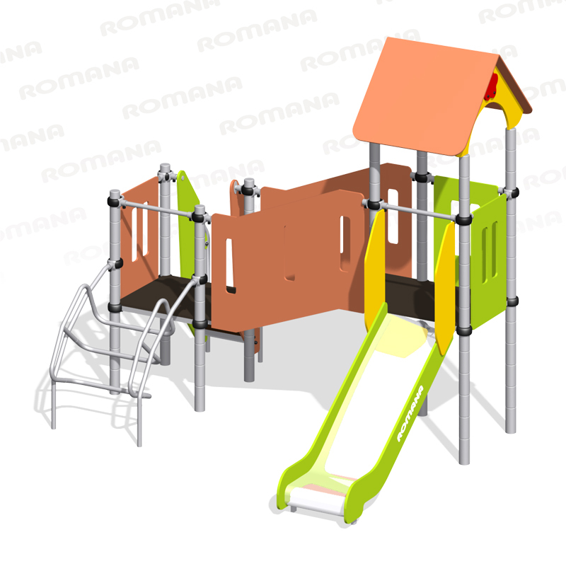 Детская площадка «Romana 104.18.00» с домиком-горкой, горкой и переходом, подходит для небольших площадок на территории детских садов и дворовых площадок, на дачном участке. Позволяет детям развивать координацию и ловкость. Изделие устанавливается на открытых уличных участках, находящихся под контролем ответственного лица – эксплуатанта. Установка Изделия должна проводится на ровной площадке, свободной от насаждений. В зоне приземления должно быть ударопоглощающее покрытие (песок, древесные опилки) минимальной толщиной 300 мм