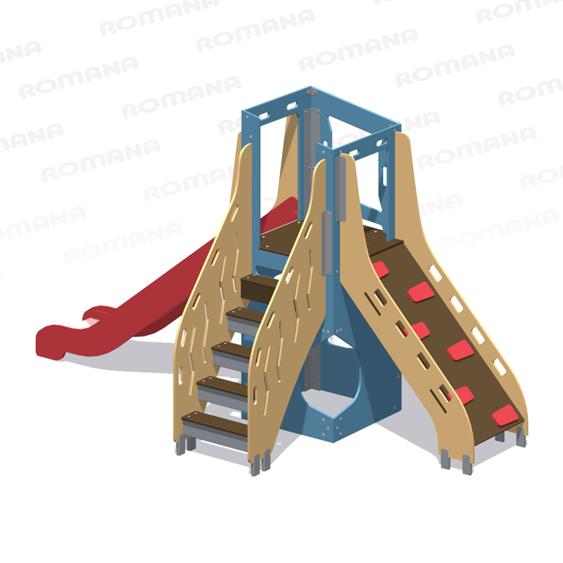 Игровой модуль для тематических игр и физического развития предназначен для детей в возрасте от 4 до 12 лет. Изделие должно представлять собой устойчивую конструкцию, обеспечивающую безопасные условия для занятий на открытом воздухе. Конструкция должна обладать высокой ударопрочностью и виброустойчивостью.В сборе представляет собой конструкцию в виде прямоугольного комплекса-башни по центру, к которому с трех сторон присоединены: лестница, горка 1250 мм и лаз напротив горки.Изделие устанавливается на открытых уличных участках, находящихся под контролем ответственного лица – эксплуатанта. Установка Изделия должна проводится на ровной площадке, свободной от насаждений. В зоне приземления должно быть ударопоглощающее покрытие (песок, древесные опилки) минимальной толщиной 300 мм.