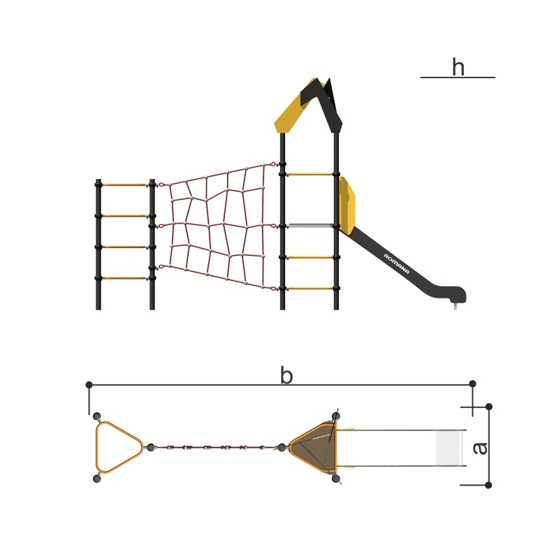 Спортивно - игровой комплекс для тематических игр и физического развития предназначен для детей в возрасте от 8 до 12 лет. Изделие представляет собой устойчивую конструкцию, обеспечивающую безопасные условия для занятий на открытом воздухе. Конструкция обладает высокой ударопрочностью и виброустойчивостью.Выполнен в виде металлических стоек, образующих треугольник, к стойкам прикреплены канатный лаз, горка.