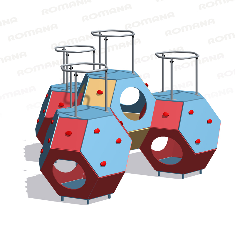 Игровой модуль для тематических игр и физического развития предназначен для детей в возрасте от 8 до 12 лет. Изделие должно представлять собой устойчивую конструкцию, обеспечивающую безопасные условия для занятий на открытом воздухе. Конструкция должна обладать высокой ударопрочностью и виброустойчивостью.В сборе представляет собой конструкцию в виде четырех игровых элементов в виде «усеченного октаэдра», один из которых располагается выше, а остальные три присоединены к шестигранной панели и расположены в плане под углом 120 градусов. Три нижних элемента установлены на грунтозацепы.