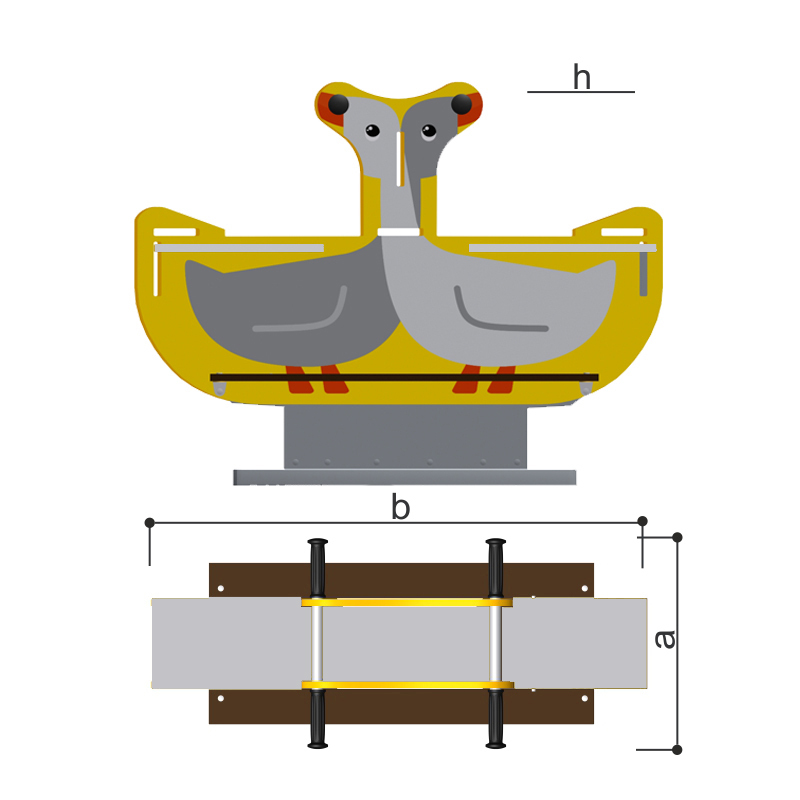 Качалка для тематических игр, предназначена для детей в возрасте от 2 лет, двухместная. На фигурную вставку при помощи УФ-печати нанесено изображение в тематике «гуси».Конструкция качалки предоставляет возможность качаться пользователю по оси «вперед-назад». Изделие приходит в движение за счет переноса веса ребенка - совершения раскачивающих движений «назад-вперед». Платформа обеспечивает плавное легкое качание, без ударов и усилий.
