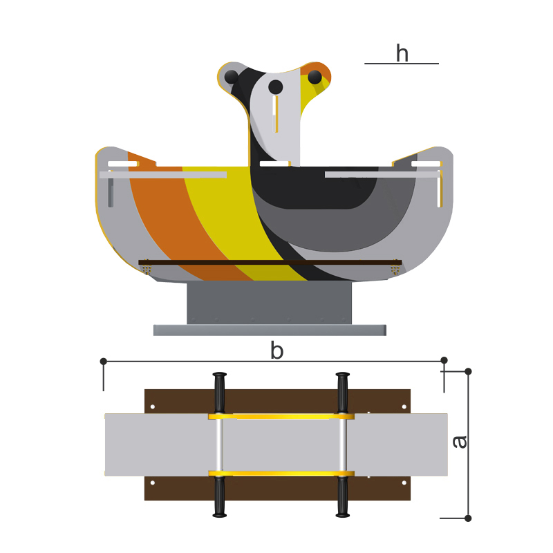 Качалка для тематических игр, предназначена для детей в возрасте от 2 лет, двухместная. На фигурную вставку при помощи УФ-печати нанесено изображение.Конструкция качалки предоставляет возможность качаться пользователю по оси «вперед-назад». Изделие приходит в движение за счет переноса веса ребенка - совершения раскачивающих движений «назад-вперед». Платформа обеспечивает плавное легкое качание, без ударов и усилий.
