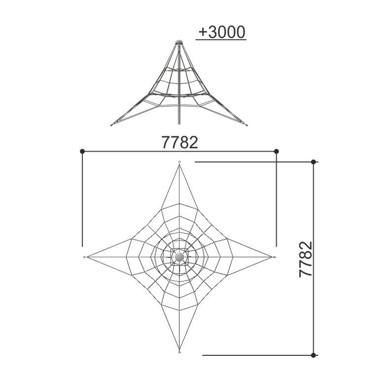 Изделие предназначено для гармоничного развития детей от 8 до 12 лет. Может эксплуатироваться круглогодично.Лаз представляет собой конструкцию в виде пирамиды, состоящего из стойки, к которой должна крепиться канатная конструкция. Канатная конструкция крепится к земле с помощью талрепов для регулирования натяжения канатов.Монтаж лаза производится путем бетонирования грунтозацепов в грунт на глубину не менее 1400 мм. Установка должна проводится на ровной площадке, свободной от насаждений. В зоне безопасности должно быть ударопоглощающее покрытие (песок, древесные опилки) минимальной толщиной 300 мм. Размер площадки не менее 9700*7800 мм. красный канат + черный крепеж