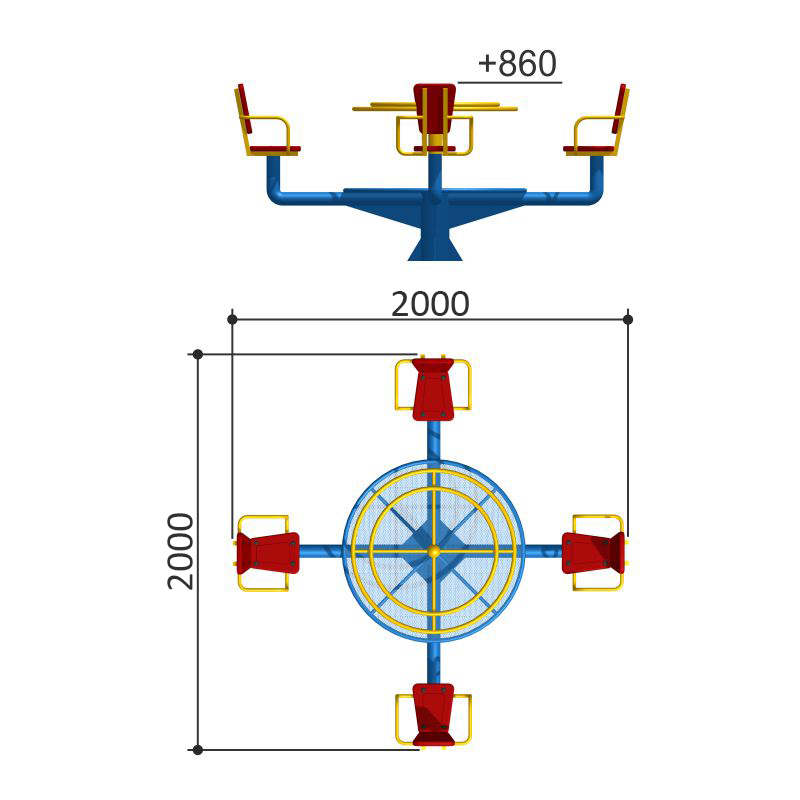 Карусель с рулем и сидениями - сине-желтые карусель с круглой платформой , четырьмя сидениями со спинками и рулем. Подходят для детей от старшего дошкольного возраста.