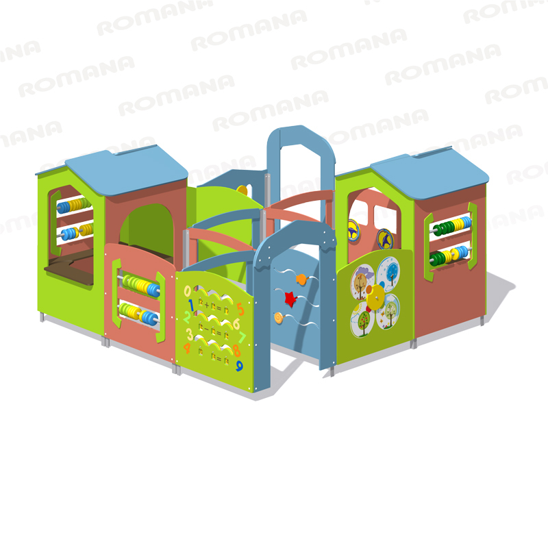 Домик-лабиринт для тематических игр предназначен для детей в возрасте от 3 до 7 лет. Изделие представляет собой сборно-разборную каркасную конструкцию из металлических стоек и фанерных элементов.
