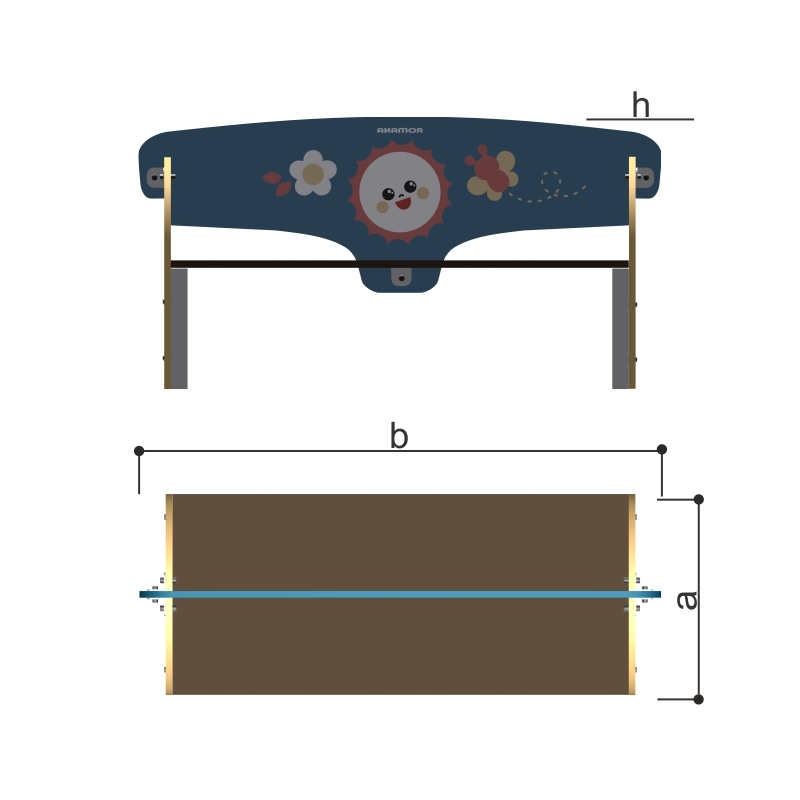Скамья двухстороняя со спинкой, которая расположена посередине скамьи. Сидения, боковые торцы изделия изготовлены из шлифованной, повышенной водостойкости (ФСФ), фанеры толщиной не менее 18 мм, спинка толщиной не менее 15 мм. На спинку с обеих сторон нанесен декоративный тематический рисунок «Солнце, цветы, бабочка» при помощи УФ печати.
